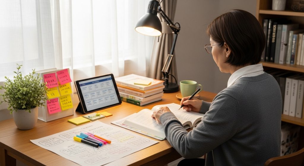 重要なのは計画にゆとりを持たせることです。ゆとりがないと勉強が進まない日があるだけでスケジュール全体が後ろ倒しになり、モチベーションを維持できなくなります。特にシニア世代は体調の変化も考慮し、余裕のあるスケジュールを立てることが大切です。学習習慣をつけるためには、「週1日6時間勉強する」より「毎日1時間勉強する」方が効果的であり、毎日決まった時間に勉強することで習慣化され自然な日課となります。